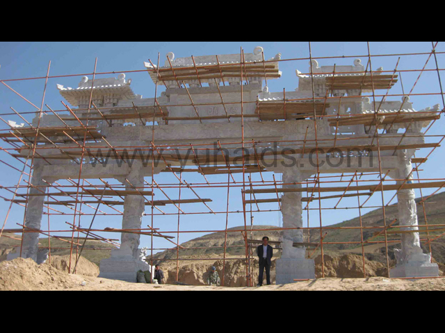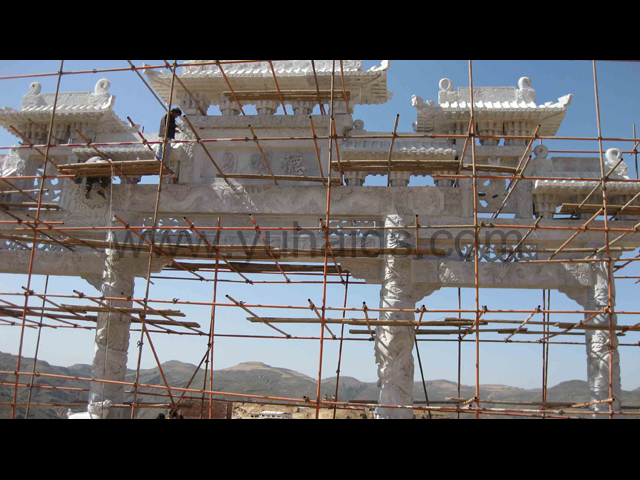 這是南京德明園大理石石雕牌坊應用案例。整個牌坊以大理石雕刻制作而成,主要以龍紋作為裝飾圖案,包括柱體和牌坊其他部件,大都可以看到龍的形態。