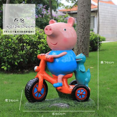 草地上擺放的騎車帶著小恐龍的玻璃鋼彩繪佩奇雕塑
