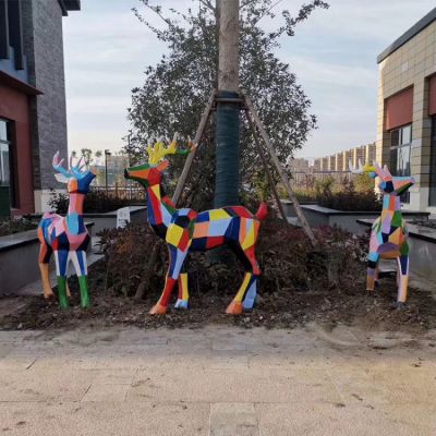 別墅小區不銹鋼幾何彩繪塊面梅花鹿雕塑