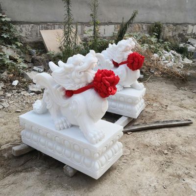 庭院門口擺放天然優質漢白玉浮雕麒麟抱鼓石