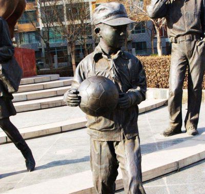 廣場擺放拿足球的小學生人物鑄銅雕塑