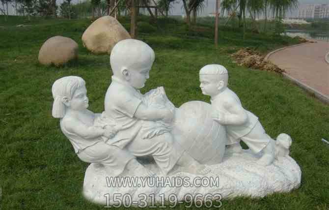戶外草坪漢白玉石雕拔蘿卜的兒童雕塑.圖片展示