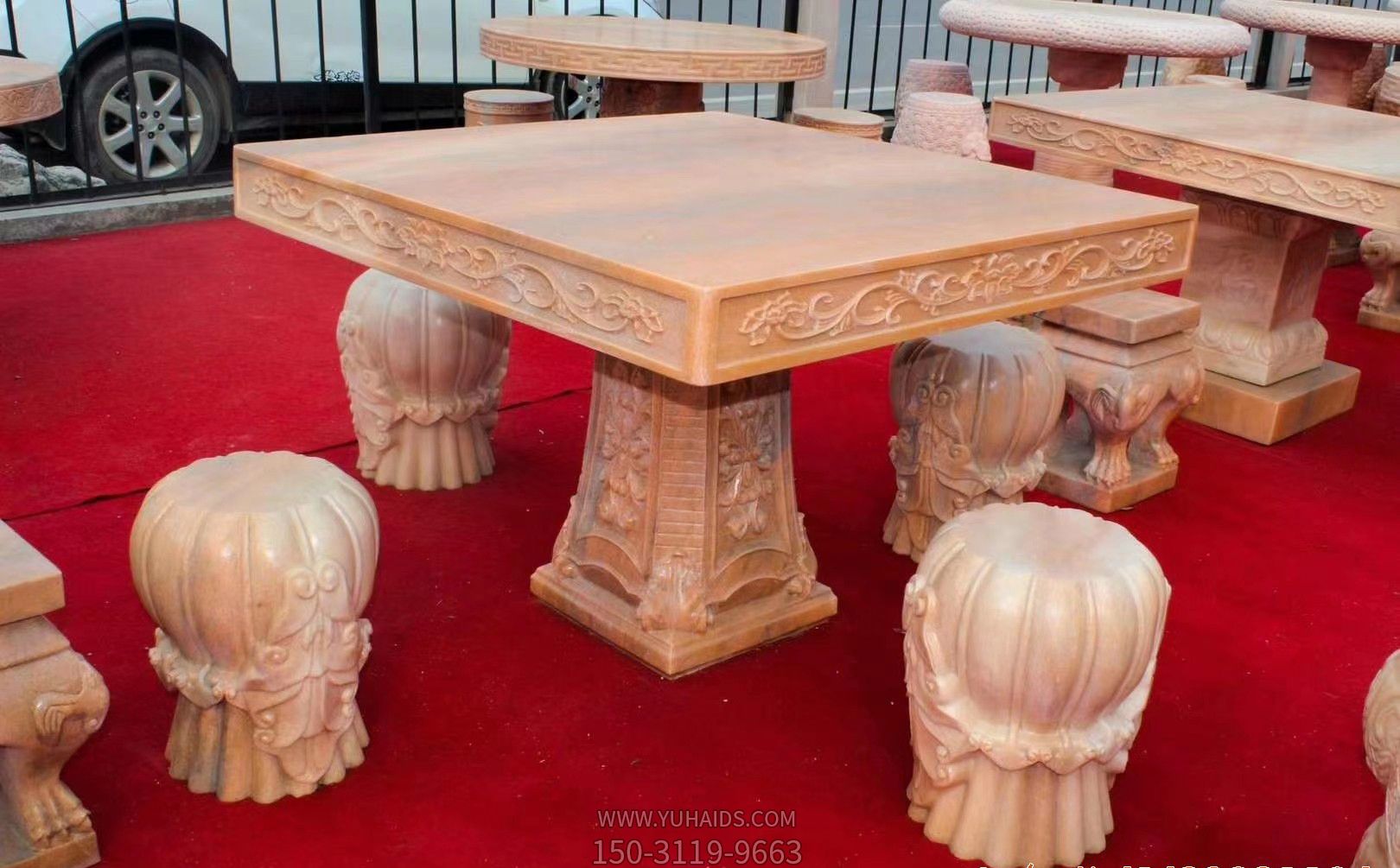 花園廣場擺放晚霞紅方形石桌凳雕塑.圖片展示