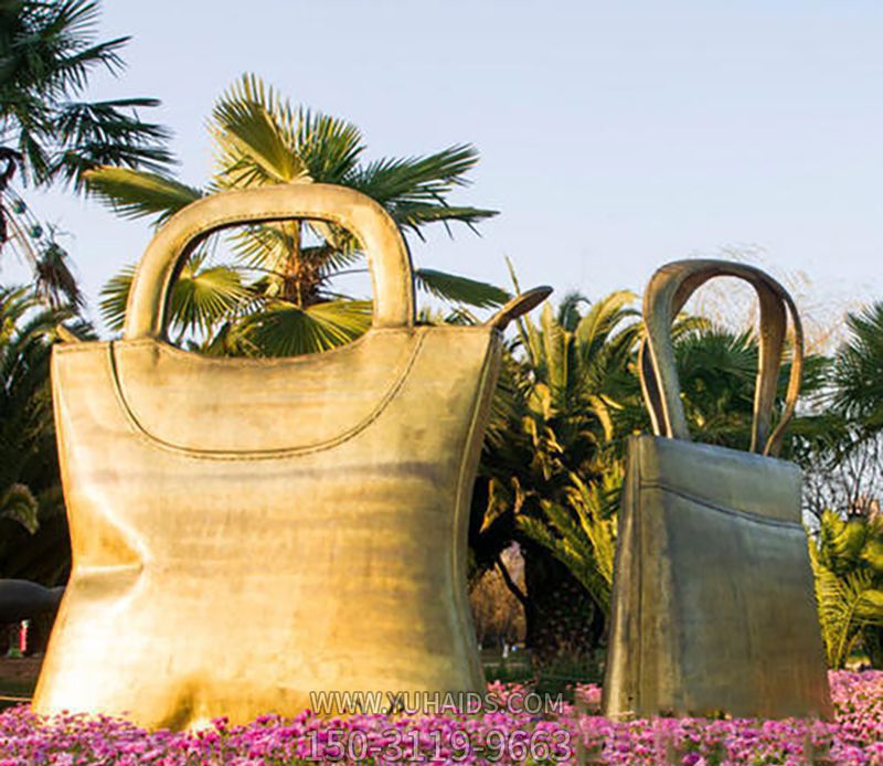公園小區廣場鑄造鎏金兩只黃銅購物袋雕塑.圖片展示
