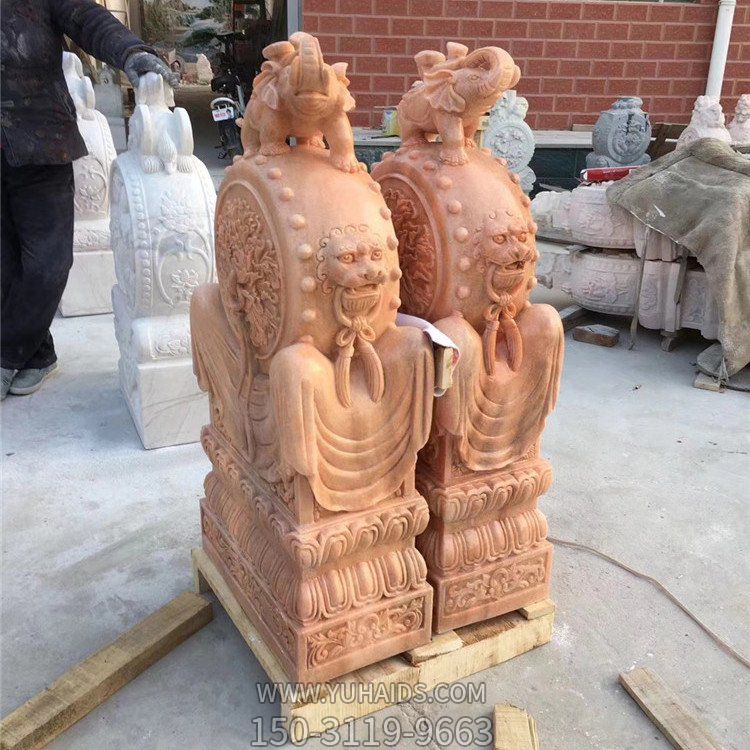 晚霞紅石雕戶外園林景觀浮雕庭院門口一對抱鼓石雕塑.詳細說明