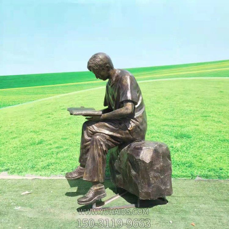 公園戶(hù)外坐在石頭上看書(shū)的玻璃鋼仿銅人物雕塑.圖片展示