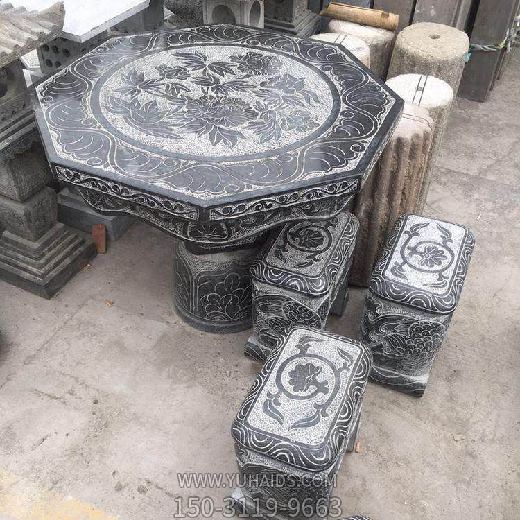 別墅公園擺放青石雕花仿古石桌石凳雕塑.圖片展示