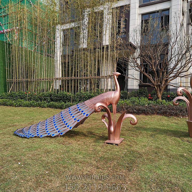 草坪上一只拖著半開尾巴的不銹鋼鏤空孔雀雕塑
