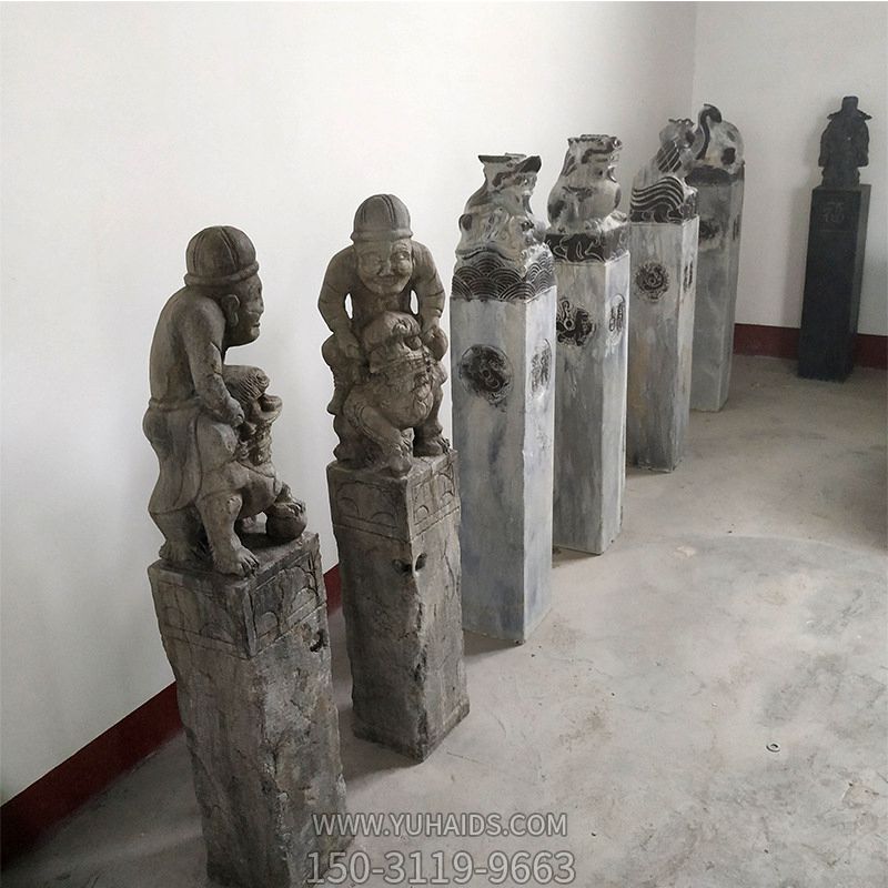 景區宮殿門前擺放青石人物拴馬柱雕塑.圖片展示